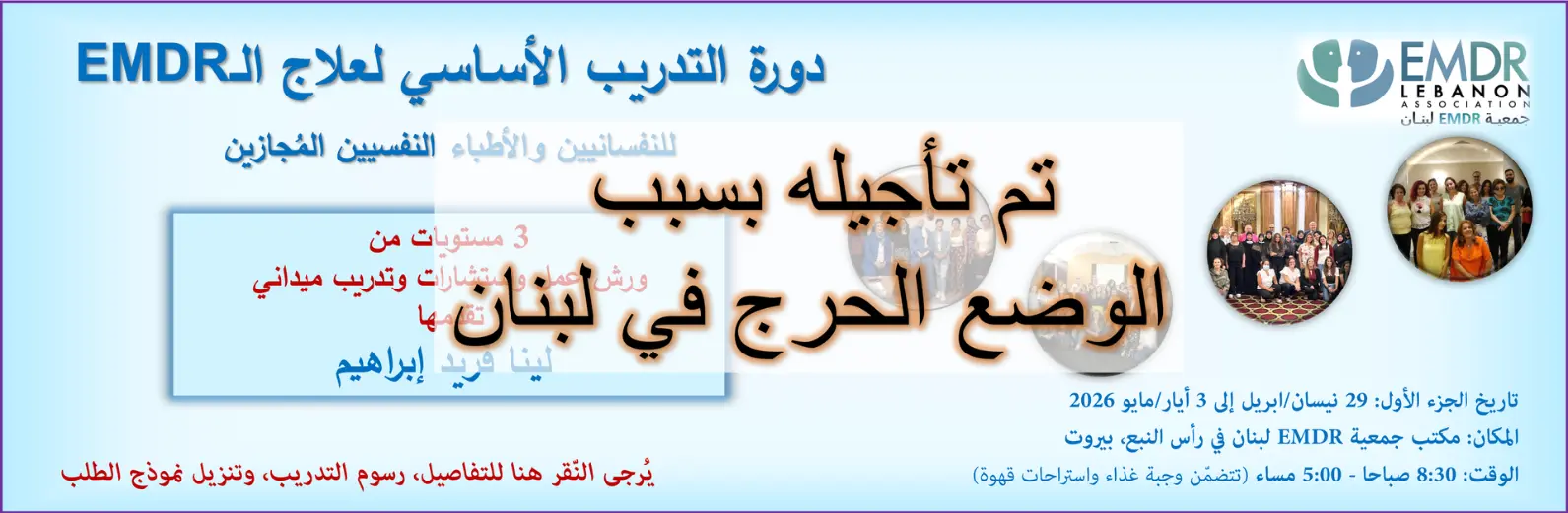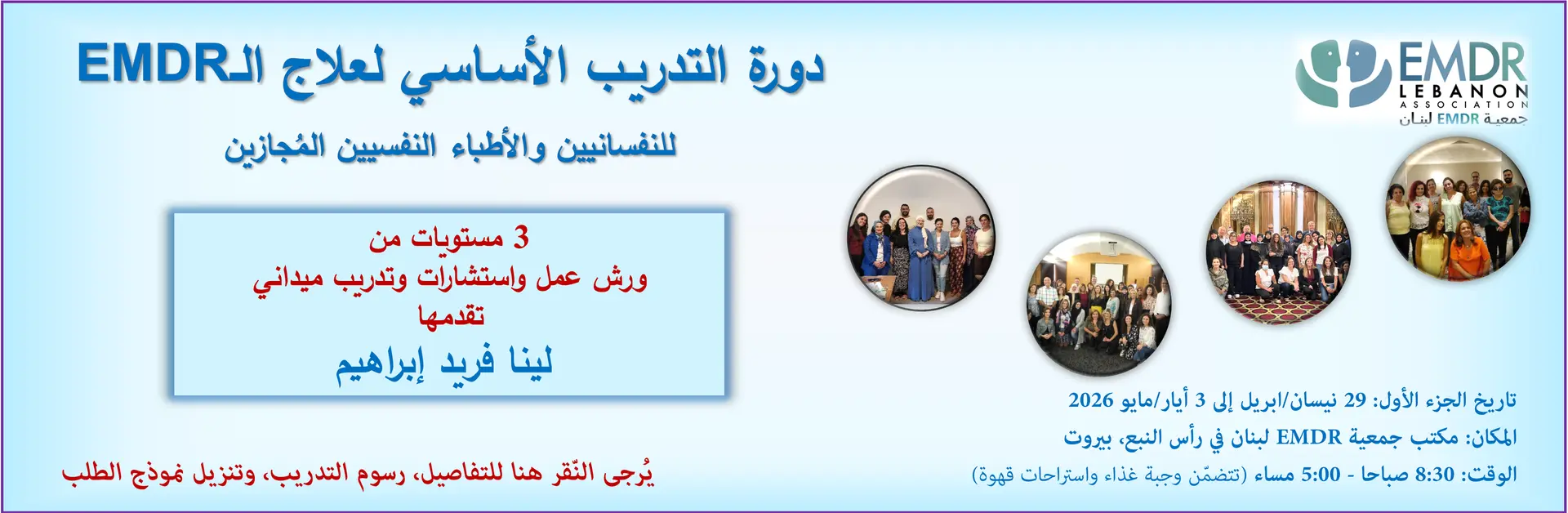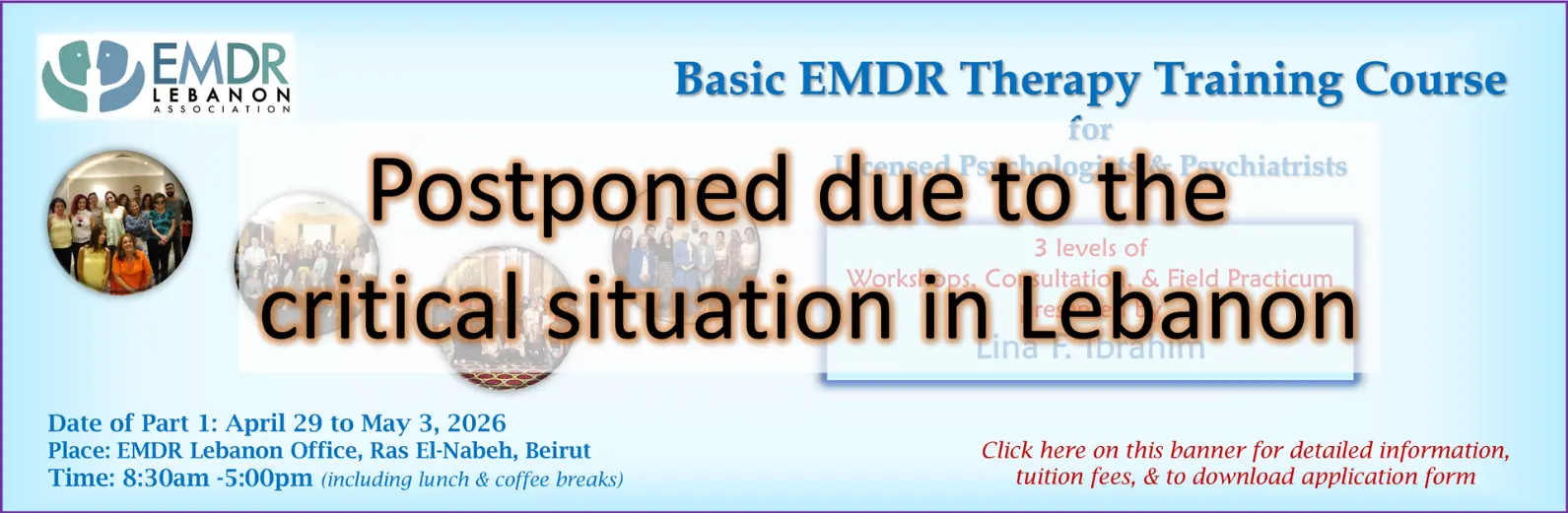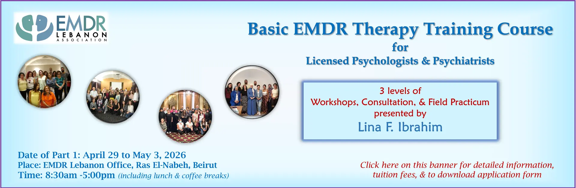 EMDR Lebanon Association’s main purpose is to introduce EMDR Therapy to the Lebanese community and to spread the awareness of its efficacy and potency in treating Posttraumatic Stress Disorders as well as other psychological disorders that originated from traumas and unprocessed negative experiences. It also seeks to organize EMDR training workshops, lectures, and conferences for mental health professions in Lebanon and the Arab world. Furthermore, EMDR Lebanon Association wishes to take part in building a network of communication among EMDR clinicians nationally and internationally.